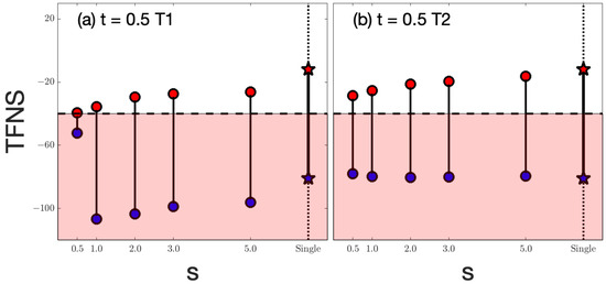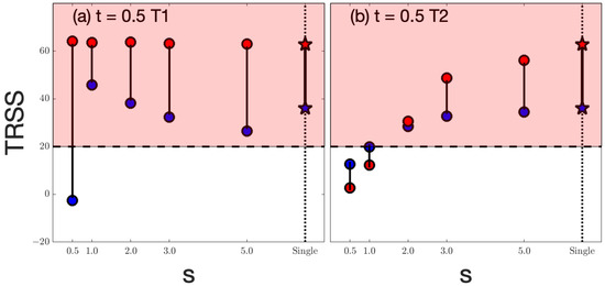 Figure 9. Peak TRSS for t = 0.5 for various s. Red symbols represent the upper CTB for each of the twin embryos and blue the lower one. The shaded region indicates areas with TRSS>CGSS. (a) T1 (upper twin embryo) and (b) T2 (lower twin embryo) in Figure 1b. The red and blue stars correspond to the single twin embryo case.