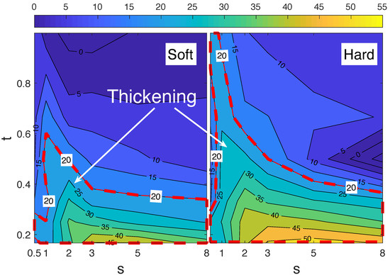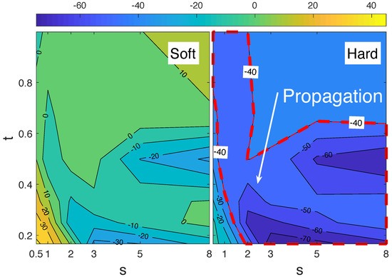Since both s and t can influence the local stresses relevant for thickening and propagation, we plot the peak driving forces on s and t axes in Figure 10 (map of TRSS) and Figure 11 (map of TFNS). Figure 10 presents the peak TRSS in the upper CTB of T1 for a soft and hard neighbor orientations. The map identifies that for most s, thickening is possible when the embryos are thin, t 0.4 . It also reveals that closely spaced embryos can promote thickening, particularly when the neighboring orientation is plastically hard.