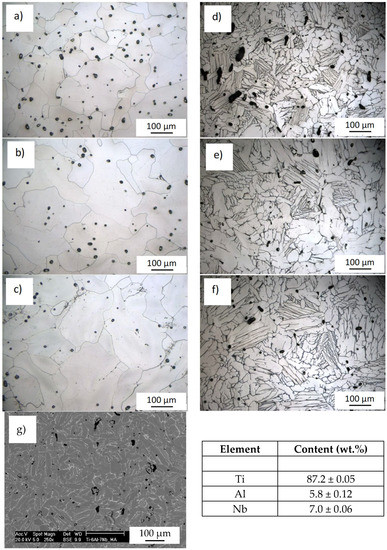- Henriques, V.; Sandim, H.; Coelho, G.; da Silva, C. Microstructural Evolution during Hot Pressing of the Blended Elemental Ti–6%Al–7%Nb Alloy. Mater. Sci. Eng. A 2003, 347, 315–324. [Google Scholar] [CrossRef]
