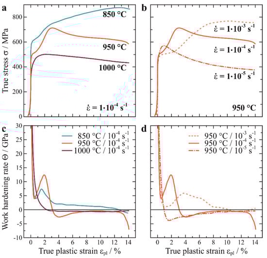 Further tests at 1 ⋅ 10−3 s−1 and 1 ⋅ 10−5 s−1 were carried out at 950 °C. The corresponding stress-strain curves are plotted in Figure 1b. At a strain-rate of 1 ⋅ 10−3 s−1, the material reveals a significantly lower work hardening rate, which starts at a higher plastic strain and extends over a longer strain range, compared to a strain-rate of 1 ⋅ 10−4 s−1 as shown in Figure 1d. In contrast, at 1 ⋅ 10−5 s−1, the initial work hardening is much stronger, the maximum strength shifts to a lower plastic strain and the softening afterward is more pronounced than at 1 ⋅ 10−4 s−[1 (see Figure 1b).