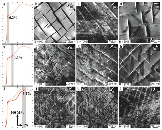 Figure 2 shows the defect- and microstructure after different levels of strain. The corresponding stress-strain curves of the interrupted specimens are shown in Figure 2a,e,i compared with the uninterrupted curve. At 0.2% plastic strain, the deformation is highly inhomogeneous. While some areas of the specimen are free of defects (Figure 2b), other regions are full of dislocations and stacking faults (Figure 2c). When dislocations cut into the γ′ precipitates, the nature of the resulting stacking faults is mostly intrinsic as determined by the fringe contrast criterion in CDF images (Figure 2d). However, in rare cases, superlattice extrinsic stacking faults (SESFs) are also observed but only inside slip bands (Figure 2c). Although the cutting of the precipitates can occasionally be observed, most of the deformation is concentrated in the γ matrix. After further deformation to a plastic strain of about 1.1%, the alloy only slightly hardens. Even after this strain, the deformation is still localized in deformation bands and in the γ matrix phase (Figure 2f–h). However, some dislocation pairs coupled with an anti-phase boundary (APB) are able to shear the γ′ precipitates (see white arrows in Figure 2g). APBs created by single superpartial dislocations are also occasionally observed in the γ′ precipitates (see white arrows in Figure 2f). In addition, defect configurations could be identified in this condition where a SISF is coupled with an APB (white dotted arrow in Figure 2g). It was also found that both SISF and SESF are present in the shear bands, while SISFs are still almost exclusively observed outside the bands (Figure 2h). With further deformation up to the maximum stress at about 3.2% plastic strain, the strength increases significantly. The deformation structure reveals that this increase in strength is accompanied by a significant increase in stacking fault density, as can be seen in Figure 2j–l. Furthermore, as additional diffraction reflections appear in TEM diffraction patterns (DPs), it can be assumed that some SESFs have transformed into microtwins. In addition, the microstructural images in Figure 2j–l show that the planar defects interact with each other at different slip planes. Occasionally, APBs generated by single matrix dislocations have also been observed. However, these occur to a much lesser extent compared to SISFs and SESFs and thus their contribution to the overall deformation is negligible. As can be seen in Figure 2l, shear bands with a significantly higher defect density compared to the surrounding areas are still present.