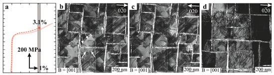 Defect structures in VF60 after a compression test at 950 °C and a strain-rate of 1 ⋅ 10−3 s−1 interrupted at a plastic strain of 3.1%. The interrupted stress-strain curve is shown in (a). All TEM micrographs were taken in two-beam conditions close to the [001] zone axis and with (b,d) g = 0–20 (BF) and (c) g = 020 (CDF).