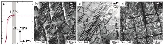 Defect structures in VF60 after compression tests at 1000 °C and a strain-rate of 1 ⋅ 10−4 s−1 interrupted at a plastic strain of 1.3%. The interrupted stress-strain curve are shown in (a). All TEM micrographs were taken in two-beam conditions close to the (b,d) [001] or (c) [101] zone axis and with (b) g = 0–20 (CDF), (c) g = 020 (BF) and (d) g = 0–10 (CDF).
