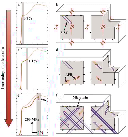 Schematic drawings of the evolution of the defect structure in VF60 at 950 °C; (b) Initially deformation starts in the horizontal γ channels; although, SISFs are occasionally observed in the γ′ precipitates. The superposition of the misfit stresses with the external stress is indicated; (d) With increasing plastic strain, deformation is still mainly confined to the γ channels. However, multiple shearing mechanisms are also active: shearing by APB-coupled dislocation pairs, by single superpartial dislocations, and by stacking faults connected to APBs. (f) After the γ matrix channels are filled, massive SSF-based shearing occurs, which also leads to the formation of microtwins and is the reason for the high work hardening. In (a,c,e), the stress-strain curves up to the discussed strain level are shown.