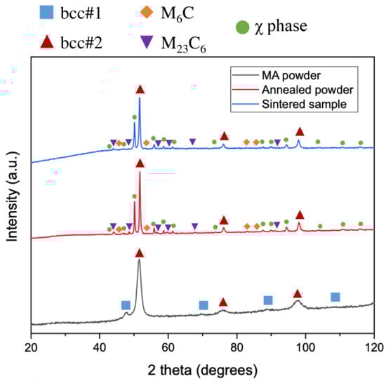 According to the XRD results (Figure 1), the MA powder consists of two bcc phases. The predominant phase is bcc#2 (a = 2.91 Å, lattice parameter close to chromium and iron, ICDD PDF 00-006-0694), while the minor phase is bcc#1 (a = 3.13 Å, lattice parameter close to molybdenum, ICDD PDF 00-004-0809). Similar lattice parameters were detected in other powders from the Al-Cr-Fe-Mn-Mo system [32]. The formation of the bcc phase after MA is not surprising because Cr, Fe, Mn, and Mo present the bcc structure as pure elements, while Al is known as a bcc phase stabilizer. The annealing of the powder at 950 °C causes the disappearance of the bcc#1 phase. The annealed powder consists of a predominant bcc#2 phase (a = 2.90 Å), intermetallic χ phase (a = 8.95 Å; space group: I-43m (217), ICDD PDF 01-081-3981), and very small fractions of carbides—M6C (a = 11.15 Å; space group: Fd-3m (227), ICDD PDF 01-083-3017) and M23C6 (a = 10.66 Å; space group Fm-3m (225), ICDD PDF 00-035-0783). The structure of the bulk sample is similar to that of the annealed powder. The presence of carbides is related to the carbon contamination from balls and vial materials during MA and from graphite die during sintering. Carbon contamination during powder metallurgy processing is common and often results in the formation of carbides [14,15].