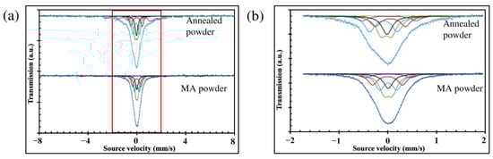 Mössbauer spectra of MA and annealed powder: (a) main spectra; (b) zoomed central part of the spectra.