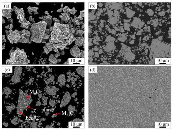 The SEM microstructural analysis of MA powder was conducted to verify the homogeneity of the powder before sintering. The powder is homogeneous in the SEM-BSE images (Figure 3b), which means it is not possible to distinguish the bcc phases at this scale of analysis. It is related to a nanometric grain size which is common for powder metallurgy samples [13]. However, slight contamination by iron was detected by EDX, which is related to the erosion of the balls and vial during MA. The final composition is 18 at.% Al, 21 at.% Cr, 37 at.% Fe, 18 at.% Mn, 6 at.% Mo, close to the starting composition. The analysis of the annealed powder revealed a significantly different microstructure (Figure 3c). Nevertheless, the particle size and morphology of the annealed powder did not significantly change compared to mechanically alloyed powder. Based on the comparison between SEM, EDX, and XRD results, the dark grey matrix phase was associated with the bcc#2 and the light grey contrast corresponds to the intermetallic χ phase. The grey contrast was associated with M23C6 carbide, while white spots correspond to M6C carbide. The microstructure of the bulk sample (Figure 3d) is similar to that of the annealed powder. The analysis of the annealed powder and the bulk sample showed that the resulting structure is purely the effect of the temperature, and the pressure during sintering did not impact the phase formation. Moreover, it should be noted that the phases are distributed homogenously, which confirms further uniform distribution of elements in MA powder. The MA process seems crucial in obtaining a homogeneous distribution of phases in the bulk sample.