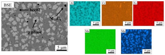 Most HEAs consist of solid solution phases, such as body-centered cubic (bcc) or face-centered cubic (fcc), due to their stabilization by high mixing entropy resulting from the multielement composition [1]. However, in some HEAs, intermetallic phases, such as Laves, σ, B2, L12, L21, µ, χ, and η, were detected [16]. The σ is the most commonly detected intermetallic phase in HEAs [17], but other intermetallics are less frequently reported. One of them is the χ phase [18,19,20,21,22,23], which is detected more commonly in steels [24,25] and was first described by Andrews [26]. The χ phase is based on the bcc structure (space group: I-43m (217)) with a large lattice parameter of 8.92 Å [24]. The hardness of the χ phase in the Al0.25Ti0.75CoCrFeNi HEA is approximately 1090 HV [19]. Therefore, a hard intermetallic phase, such as χ phase, could improve the hardness and wear resistance.
