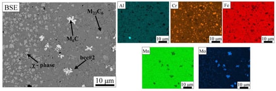 The SEM-EDX analyses (Figure 4 and Table 2) showed that the bcc phase has a composition relatively close to the overall powder composition, and the χ phase is slightly enriched in Mo (approximately 11 at.%). The M23C6 carbide is chromium-rich, while M6C is rich in molybdenum, which is common for these carbides. The volume fraction of phases in the center of the sample (shown in Table 2) revealed a predominance of the bcc#2 phase and high content of the χ phase. Some small volume fractions of carbides (M6C and M23C6) were also detected. The volume fraction of phase in annealed powder is similar to that of the bulk sample, i.e., 71 ± 2% of bcc#2 phase, 27 ± 2% of χ phase, 1 ± 1% of M6C, and 1 ± 1% of M23C6. The results concerning phase content are in agreement with the XRD results, which revealed a predominance of bcc#2 phase, a high-volume fraction of χ phase, and a small content of multielement carbides.