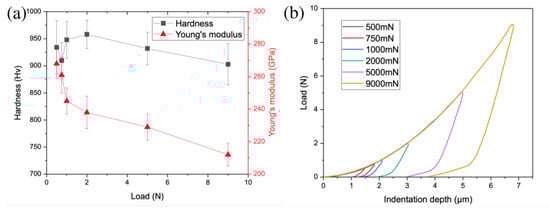Mechanical properties investigations: (a) hardness and Young’s modulus as a function of indentation load; (b) indentation curves under different loads.