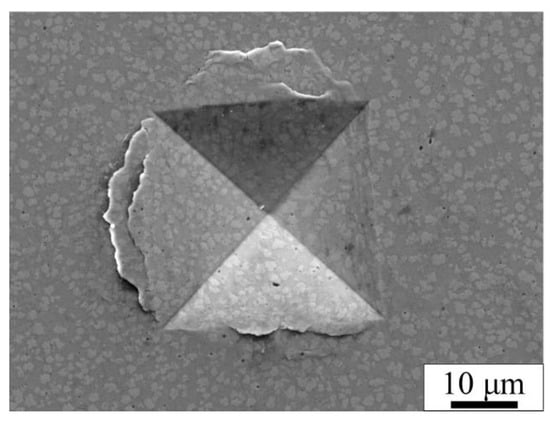 The SEM observations revealed the presence of circumferential cracks in the vicinity of indentation sites (Figure 7). It shows the brittleness of the alloy, which is caused primarily by the presence of the intermetallic χ phase, which is known to be very brittle [48]. The brittleness increase due to the χ phase was reported in other HEAs [18,19]. However, there are no radial cracks, which are typical for brittle material [49]. Therefore, some plasticity of this sample due to the less brittle matrix bcc phase is revealed.