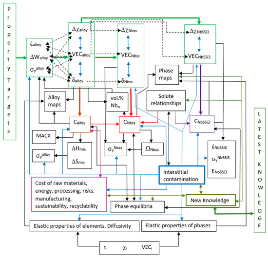 Similarly with the design of steels, light metal alloys (Al, Mg, Ti-based) or superalloys, NICE uses the results of first-principles calculations for phase equilibria data and phase diagrams and the results of experimental studies of alloying behaviour of transition metal (TM) and simple metal alloys, e.g., [22,23,24,25,26,27,28,29,30,31,32,33,34,35,36,37]. Within the framework of NICE are developed thermodynamic descriptions in new “composition spaces” to guide alloy developers to design alloys for high-temperature applications, e.g., [38,39,40]. NICE also has a say about the oxidation of these alloys [7,19,41,42,43,44,45,46,47], the contamination of their phases with interstitials, in particular oxygen, and how interstitial contamination affects properties, namely hardness, specific yield strength and Young’s modulus, e.g., [8,20]. Furthermore, NICE uses, when applicable, the latest and new knowledge generated by research (see Section 5.2), considers costs, engineering, and ecological issues (see below) and motivates metallurgists to discover new links between processing, microstructure, and properties, and draws attention to matters that theory and modelling must address. The evolution of NICE for metallic UHTMs with Nb and Si additions and its capabilities was discussed in [7,9,20,21,48]. Most important in NICE are synergy, entanglement (see Appendix A and below) and self-regulation (see Section 6). An objective of NICE is not so much to obtain new data about metallic UHTMs as to discover new ways of thinking about them.