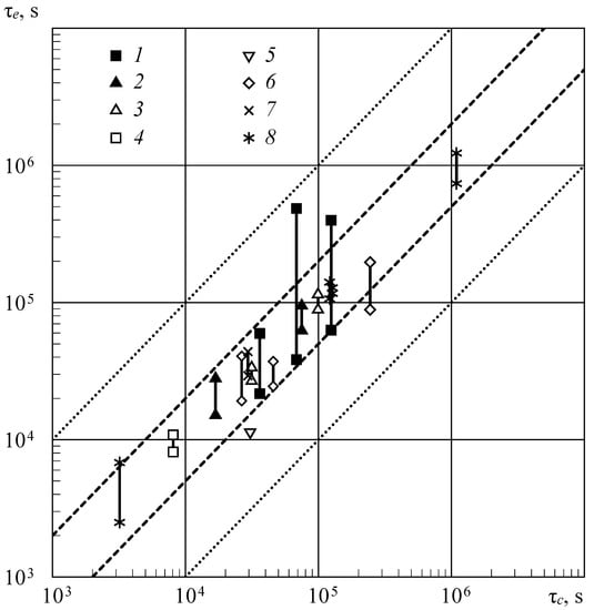 Figure 6 shows that the calculated estimates of durability fall within a two-fold range of deviations from the experimental data, which is usually observed when testing the same material of different batches. The calculations are made taking into account the decay of a supersaturated metal solid solution in a given alloy aged to the second maximum hardness (T1 state), representing the parameter in Equation (2) as the product of the residual strain with the frequency multiplier .