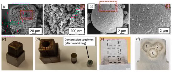 SEM image (a) of C-np powder agglomeration in different magnifications (measuring positions indicated by the red boxes) and (b) of the steel powder mixture No. 1 modified by adding 0.1 wt.-% C-np to the AISI H11 powder in different magnifications (measuring positions indicated by the red boxes), (c) manufactured specimens, (d) machined compression specimens. Experimental alignment for (e) local XRD measurements and for (f) chemical analysis using OES.