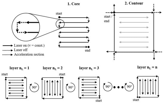 Firstly, the core of the samples consisting of parallel and overlapping single weld tracks were deposited. The hatch distance, which corresponds to distance of two parallel and overlapping single weld tracks, was kept constant at a value of 0.8 mm for all produced specimens. The laser beam was switched off at the reversal points for reducing the local thermal exposure at the edges and for preventing an enhanced material deposition at the starts and ends of the deposited weld tracks. Moreover, 1.5 mm long acceleration sections were applied at the beginning of each weld track in order to inhibit an overheating of the weld tracks at the starting points, which is essential for manufacturing test specimens with an acceptable dimensional accuracy. Subsequently, the core was dawned with a contour structure using a reduced laser power of 550 W instead of 600 W. As a consequence, the local thermal exposure at the outer range could be reduced, leading to an improvement of the dimensional accuracy of the cubical specimens. After the deposition of each layer, the starting position at the corner for the next layer was rotated in a clockwise direction by 90°. In this manner, the thermal load induced by the absorbed laser power was, to a great extent, symmetrically distributed into the structure during the ongoing AM process. Thus, the internal stresses and the susceptibility to cracking drops were decreased to a non-critical level; therefore, the layer-wise manufacturing of the 30-layered test specimens with a high dimensional accuracy was enabled.