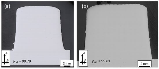 Prior to the analysis of the microstructure and the characterization of mechanical properties, the specimens were analyzed with respect to the inner defects and the relative densities that were determined, as described in the previous section. Regardless on the added C-np content and the associated total carbon content, it was possible to manufacture nearly fully dense and crack-free 30-layered test specimens with a relative density equivalent to at least 99.5%, as exemplarily illustrated in Figure 3. Consequently, the results of the previous work [29], in which the process ability of C-np-enriched AISI H11 powders for the AM of multi-layered tool steel parts were fundamentally proven, could be confirmed.