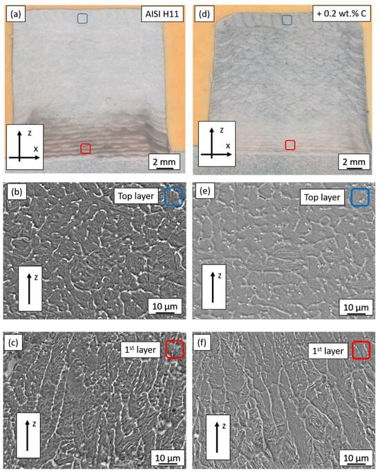 (a) Merged microscopic images of the etched cross section of the AISI H11 sample in as-built conditions and SEM images of microstructure (b) in the top layer and (c) in the first layer. (d) Merged microscopic images of the etched cross section of sample comprising mixture No. 2 (+0.2 wt.-% C.-np) in as-built conditions and SEM images of microstructure (e) in the top layer and (f) in the first layer.