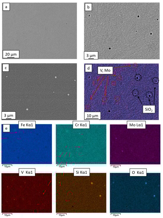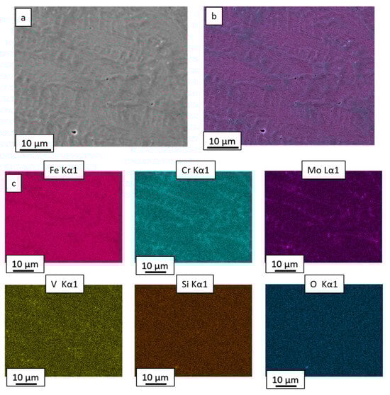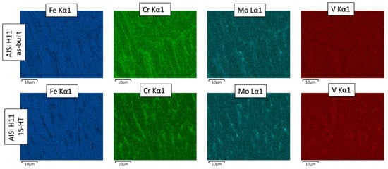 Moreover, as could be verified with EDS area mapping (see Figure 5, Figure A1 and Figure A2), the metallic main alloying elements chromium (Cr), molybdenum (Mo), manganese (Mn) and vanadium (V) occur concentrated at the inter-dendritic spaces or at the grain boundaries, respectively. In contrast, the iron (Fe) content in these areas decreases noticeably (see Figure 4b,c). This points out the formation of strength- and hardness-increasing carbides, preferably Cr- and Mo-mixed carbides from type M7C3 or M23C6 as well as VC- and Mo2C-special carbides. These observations are also in good accordance with the scientific outcomes of others who reported on the formation of a dense carbide network, which mainly consists of fine Cr-mixing carbides, in AISI H11 or similar CrMo-alloyed hot-work tool steel components manufactured with PBF-LB/M [37].