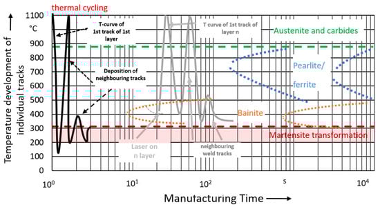 As already described in [29] and also reported by others who investigated similar tool steels in DED-LB/M [17,35], the layer-specific microstructural differences can be attributed to a kind of in-process heat treatment of the lower weld track layers during the layer-by-layer manufacturing process. As exemplarily illustrated in Figure 6, the first layer (black curve) and the lower layers are cyclically exposed to high thermal loads and are re-melted and re-austenitized several times at the beginning of the manufacturing process during the placement of further weld tracks next to or on top.