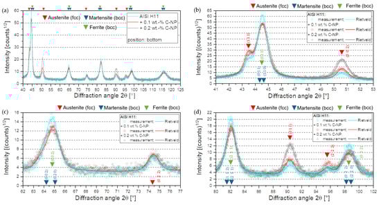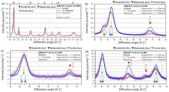 Although all specimens have the same martensite, ferrite and RA peaks, the intensities and half widths of individual reflections differ depending on the concentration of the added C-np or the total carbon content, respectively. By comparing intensities of austenite peaks of equal spatial orientations (same Miller indices) with each other (Figure 5b–d), it becomes obvious that a higher carbon content leads to higher peak intensities and a stabilization and enhanced formation of the high-temperature austenitic phase in the steel samples. In contrast to this, the intensities of the diffraction peaks of martensite and of ferrite seem to be weakened with increasing C-np content, pointing out a decrease in the concentration of these metallurgical phases (see Figure 7b–d). These observations correlate well with the outcomes of the JMatPro calculations (see Appendix A) and can be explained by the fact that carbon acts as an austenite former. Consequently, a higher total carbon content in the steel sample leads to a decrease in the martensite transformation temperatures (Ms, M50%, M90%). This leads to a stabilization and higher concentrations of the RA in the C-np-enriched tool steel specimens compared to the pure AISI H11 sample.