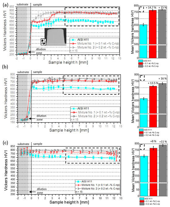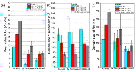 Figure 8a shows the mean values of the RA content determined using XRD for specimens under as-built conditions and post-heat-treated samples. The mean value of the RA-c of specimens in as-built conditions increases from 9.5 ± 2 vol.% for the unmodified AISI H11 sample to 15.2 ± 2.6 vol.% for the sample manufactured out of powder mixture No. 1 and to 21.4 ± 7.1 vol.% for the specimen containing a maximum C-np content of 0.2 wt.-% (powder mixture No. 2). Consequently, the addition of 0.2 wt.-% C-np more than doubled the RA-c on average. The large standard deviations of the mean values in the order of 20% or more indicate a location dependency of the RA content (see Figure 8a and Table 6).
