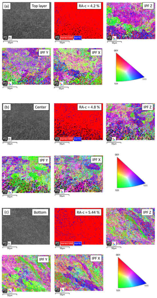 While the EBSD measurements are mostly allocated to small measuring areas, XRD measurements enable the analysis of larger measuring areas with a comparably moderate amount of work. In this way, by evaluating the diffraction diagram, a reliable mean value of the RA-c and of a crystallite size (domain size) of the RA and of martensite can be determined. The XRD examinations were performed using the measuring device Philips X’Pert MRD (Amsterdam, The Netherlands). The diffraction angle (2θ) varied between 25° and 125° with a step size of 0.03°. As can be seen in Figure 1e three single measurements were performed at three characteristic locations for each specimen to investigate the RA-c with respect to the sample height. Here, each rectangular-shaped measuring surface had a length (l) of 6 mm and a width (b) of 3 mm (see Figure 1e).