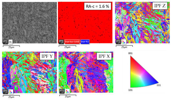 Both electron backscatter diffraction (EBSD) and X-ray diffraction (XRD) measurements were conducted in order to achieve a comprehensive understanding of the effect of the added C-np on the microstructural properties of the studied materials with a focus on the occurrence of metallurgical phases, the retained austenite (RA) content, texture and domain (crystallite) size of martensite or grain size. For EBSD, the cross sections were polished using a fine acidic alumna suspension containing granules in the order of 0.1 µm. The field emission scanning electron microscope Gemini II from Carl Zeiss Microscopy GmbH (Jena, Germany) was equipped with an EDS detector from Oxford Technologies and was used for carrying out SEM imaging, EDS mappings and EBSD investigations.