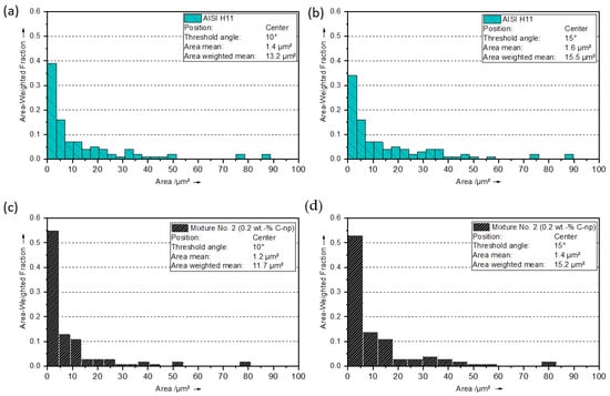 Figure 8b,c show the mean values of the domain size of martensite and of the RA for the processed tool steel powders and with respect to the heat treatment performed. As already mentioned in Section 3, the values are derived based on the Rietveld analysis. The domain size of martensite tends to decrease with increasing content of nanoscale carbon additives. In the AISI H11 sample, the measured mean value corresponds to 330 ± 61 Å, and takes on a smaller mean value of 180 ± 117 Å for the specimen produced with the powder mixture No. 1 containing 0.1 wt.-% C-np. The smallest value of 135 ± 20 Å is obtained for the specimen with a maximum C-np concentration of 0.2 wt.-%.