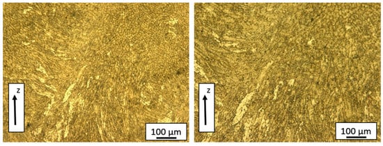 Furthermore, by investigating the microstructure with respect to the sample height, it is discernable that all specimens have differences in local or at least layer-specific inner structure. Low-magnification OM analysis of etched cross sections revealed two characteristic regions (compare to Figure 4a,d). Independently, on the processed tool steel powder mixture, the bottom part is slightly over-etched and appears darker in the microscopic images. This seems to be an indicator for the presence of multiple re-austenitized and cyclically tempered martensites. In contrast to the middle and upper section of the tool steel samples, the martensite takes on a brighter coloration, which is characteristic for freshly formed martensite when V2A Beize is used as the etchant.