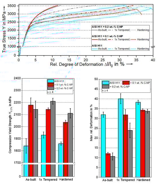 For the investigation of the effect of C-np on mechanical strength, compression tests were carried out according to DIN 50106 using the universal testing machine Quasar 100 from Galdabini (Cardano al Campo, Italy). For that purpose, as exemplarily shown in Figure 1d, the cube-like samples were machined to cylindrical compression specimens with a diameter of 6 mm and a height of 9 mm by applying different subtractive manufacturing technologies (wire erosion cutting, followed by turning and circular grinding). The maximal compression force was set to 100 kN, which was equivalent to the maximal adjustable load. The upsetting velocity was kept constant at a value of 5 mm/min, which corresponds to an experience value. On the basis of the recorded stress–strain curves, the compression yield strength Y0.2%, maximum compression stress and maximum degree of deformation (maximum strain) were determined. To ensure a statistically relevant outcome, five specimens were characterized and evaluated for each powder mixture and were subjected to each heat treatment condition (as-built conditions, S1-HT and S2-HT).