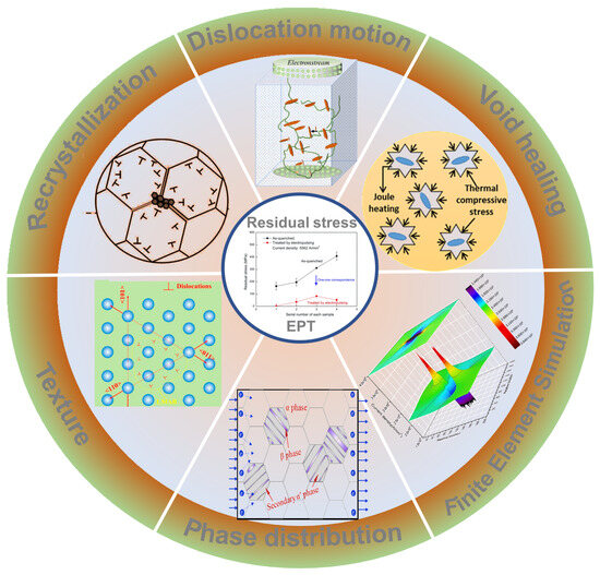 To sum up, throughout the EPT procedure, the generation of Joule heating and the movement of electrons contribute to the acceleration of atom and vacancy diffusion because of increased resistivity [120,121], thereby realizing the phase transition (development to equilibrium). Furthermore, the hot–compression stress can further promote the migration of atoms around the pores and achieve the healing of the pores.
