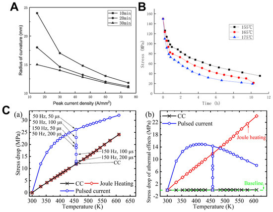 (A) Graph detailing the curvature radius of samples under varied current densities and relaxation periods [51]. (B) Diagram depicting stress relaxation trends at different temperatures post EPT [52]. (C) (a) The total stress drop; (b) the relationship between the stress drop caused by non–thermal effects and the root mean square current density of steady-state temperature, pulsed current and continuous current. The stress drop during Joule heating is provided for comparison (CC: continuous current) [53].
