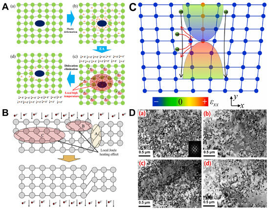 Zhang and his team [75] uncovered a stress–softening occurrence through their investigation on the influence of electric–assisted deformation on nickel–based superalloys’ a-phase, as depicted in Figure 4A. Their conclusion was that the localized Joule heat effect was responsible for this, as it encouraged both dislocation slip and dislocation recovery. Moreover, the quick rate of dislocation recovery resulted in the swift alleviation of dislocations surrounding the δ phase, which they identified as the primary cause for the formation of dislocation–free loops around said δ phase (Figure 4A(c,d)). In a separate study, Zhang and colleagues [76] theorized that dislocations running perpendicular to the current direction could hinder electron movement due to the dislocation region’s high scattering coefficient. The localized Joule heat effect caused temperatures in these areas to rise, and the resulting local high temperature prompted dislocation annihilation (Figure 4B). In Figure 4C, the highest strains can be seen at the top and bottom of the dislocation core, with less strain on the left and right sides. If the electron motion is not aligned with the dislocation, electrons move to either side of the dislocation core and are heavily scattered by the core, as the red curve illustrates. The electron detour results in a high concentration of electrons on either side of the dislocation, causing a significant electron imbalance. However, when electron motion aligns with the dislocation, scattering caused by the strain field is minimal, as demonstrated by the black curve [77]. Zhang et al. [78] suggested that the softening impact of Joule heating lessens the dislocation density (Figure 4D). Briefly, Joule heating promotes the motion of dislocations, causing them to annihilate, thereby reducing dislocation density and flow stress.