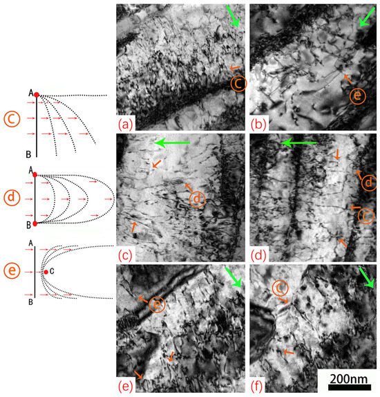 The green and orange arrows represent the direction of drift electron motion and dislocation structure, respectively. (a–f) The stress before and after EPT at the current densities of (a,e,f) 4482 A/mm2 and (b–d) 5184 A/mm2, respectively. (a) 355 MPa and 270 MPa; (b) 345 MPa and 172 MPa, respectively; (c,d) 396 MPa and 197 MPa, respectively; (e,f) 456 MPa and 197 MPa, respectively (A and B represent the two ends of the dislocation line respectively; The red arrow indicates the direction parallel to the dislocation the direction of the electron wind force; c,d,e with circle indicate where the actual dislocation structure is located) [94].
