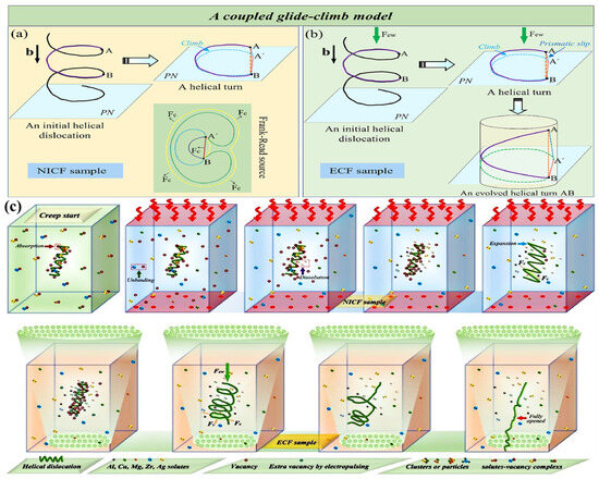 As shown in Figure 6, Zhou et al. [95] designed the non–isothermal creep–age forming (NICF) samples as controls at the same temperature to identify the non–thermal effect of pulsed current. The main climbing force of Fc is the vacancy concentration gradient, which will generate the thermodynamic driving force Fosm. The Fc can drive the edge component to climb along the direction from the normal line to Burgers vectors b, resulting in the gradual expansion of the spiral turn in Figure 6a. The synergistic effect of the electronic wind force Few and the climbing force Fc cause the spiral dislocation to evolve into a conical spiral dislocation and finally into a straight line in assisted creep–age forming (ECF) samples (Figure 6b). A schematic of the dislocation configuration during NICF and ECF sample evolution is shown in Figure 6c.