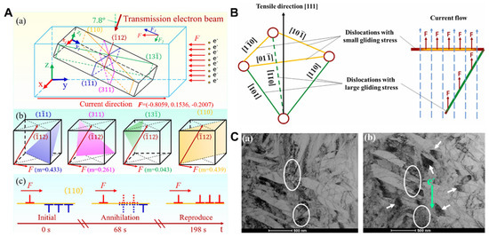 As shown in Figure 8A, Zhang and colleagues [101] documented the elimination and reformation of dislocations in superalloys under the influence of electron force, utilizing electro-in situ transmission electron microscopy. It has been demonstrated that different slip systems experience different electronic forces, dislocation regeneration will be driven by the action of continuous current, the electron force will not disappear, the continuous multiplication of dislocations occurs in region 2, and the phenomenon of dislocations are first annihilated and then regenerated in region 1. In Figure 8B, Xia et al. [102] proposed that the electronic wind facilitates the conversion of forest dislocations into active ones, activating more slip systems and shortening the pinning duration of movable dislocations. As shown in Figure 8C, Daudi et al. [103] argued that in samples subjected to high electron wind, defects like micro/nano cracks and micropores evolve into dislocation gatherings, loops and clusters. Moreover, the electron wind propels movable dislocations from near defects toward the free surface, where some dislocations are extinguished, thus reducing the flow stress. Importantly, while the electronic wind encourages dislocation multiplication, it leads to a more even strain distribution. A uniform plastic deformation of the sample correlates with a reduction in flow stress [104].