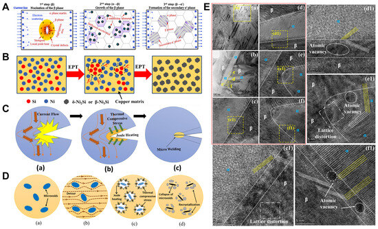 (A) Conceptual sketch of the α→β→α′ phase transformation pattern in Ti–6Al–4V under EAMC [115]. (B) Conceptual sketch of the Cu–Ni–Si alloy undergoing EPT to create precipitates [116]. (C) Conceptual visualization of the mechanism for crack healing, the stages of crack healing are shown in (a–c) [117]. (D) (a) The generation of micropores due to plastic deformation; (b) the rerouting effect of the current in the defect zone; (c) Joule heating and thermal compressive stress surrounding the micropores; (d) the collapse and recrystallization of the micropores [118]. (E) High–resolution TEM (HRTEM) images of the α/β interface in EST3: (a,b) chosen areas of the α and β interfaces; (c,c1) the coherent α/β interface of the three–point grain boundary; (d,d1) distorted α/β interface and imperfections; (e,e1) imperfections at the edge and inside of the interface; (f,f1) distortion of three–point grain boundaries and imperfections along the interface [119].