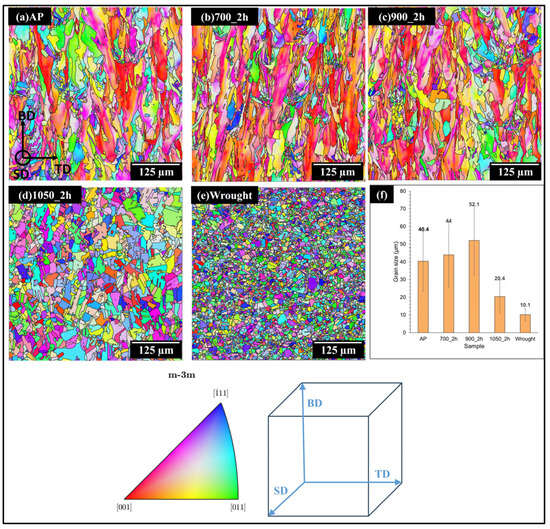 (a–e) Inverse pole figure (IPF) maps of as-printed and heat-treated L-PBF IN625 along the BD compared to wrought IN625; (f) grain size evolution of each sample.