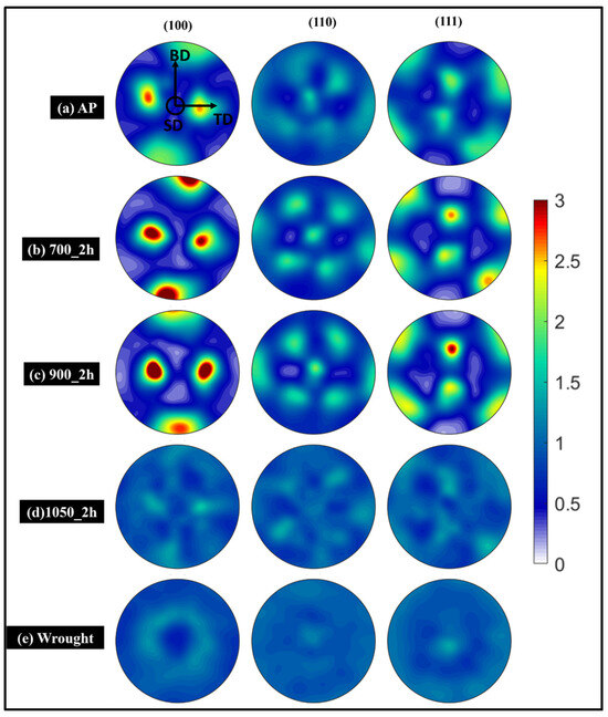 Pole figures (PFs) of as-printed and heat-treated L-PBF IN625 compared to wrought IN625.