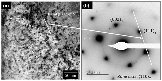The δ phase precipitate was only observed in the 700 °C and 900 °C sample sets. Figure 5a shows a bright-field image of the 700_2h sample, where 20–100 nm long, needle-shaped precipitates can be observed. The SAED pattern shown in Figure 5b confirms that these precipitates are δ phase. Here, the orientation along the <110>γ zone axis confirms the presence of at least two δ phase variants (δ1 and δ2) oriented with the matrix γ phase habit plane (111)γ. The variants are oriented at approximately a 70° angle with respect to each other. Similar findings have been reported by other researchers for traditional Inconel alloys, where two variants of δ precipitates were found that can be defined as “orientation twins” or “antiphase domain structures” [37,38]. The orientation relationship of the δ phase precipitates with the γ matrix is [9,36]: