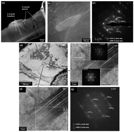 (a) TEM thin film taken from the 900_2h sample; (b) bright-field TEM image of a δ precipitate on GB and (c) corresponding SAED pattern; (d) bright-field TEM image of a δ precipitate inside the grain; (e) HRTEM image of a δ precipitate with FFT showing γ matrix and stacking fault; (f) HRTEM image of a δ precipitate with (g) an FFT pattern of area 3 indexed for the δ precipitate.