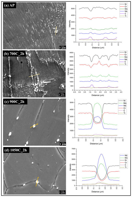 Carbides are another precipitate typically observed in alloy IN625 [1,2,19]. In this work, they were observed in all L-PBF samples, as shown in Figure 7. EDS line scans (indicated by yellow arrows) was performed on each sample to confirm the presence of carbides. Clusters of irregularly shaped carbides were observed in locations where two melt pool boundaries met in AP IN625 (Figure 7a). The deficiency of Ni and Cr, coupled with Nb and Mo enrichment in the particles, indicated the presence of (Nb, Mo)C. The irregular morphology, formation during solidification, and interdendritic location also point toward the formation of MC [2,19,29]. The formation of carbides is generally facilitated by Nb and Mo segregation in the interdendritic region due to a fast cooling rate [29]. The accurate size of the carbides is challenging to measure since they can be overlapped with the elemental segregation, but it appeared to be in the range of around 500–900 nm. Marchese et al. reported the presence of nanometric-sized Nb-rich MC near the interdendritic region of as-built L-PBF IN625. Liu et al. [28] observed circular M23C6 precipitation in as-built IN625 produced via SLM as well as laser-engineered net shaping (LENS) in the intergranular region.