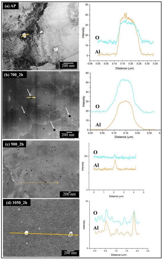 Al2O3 particles with EDS spectra in (a) TEM BF image from AP; (b) TEM BSE image from 700_2h; (c) SEM BSE image from 900_2h; and (d) SEM image from the 1050_2h sample.