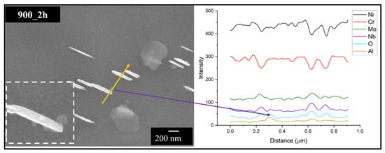 Block-shaped carbides are observed in evanescent interdendritic regions of the 900_2h sample, as shown in Figure 7c. Considering the treatment temperature and their composition as measured by EDS, they appear to be the already-formed primary MC carbide that grew after aging. The carbides are around 770 nm. However, some significantly smaller carbides on the order of 300 nm can also be observed in the matrix. These carbides are likely secondary carbides and are developed in the form of Nb- and Mo-rich MC and M6C at this temperature [3,19]. The presence of 9% Mo in the alloy composition also facilitates the formation of Mo-rich M6C [2].