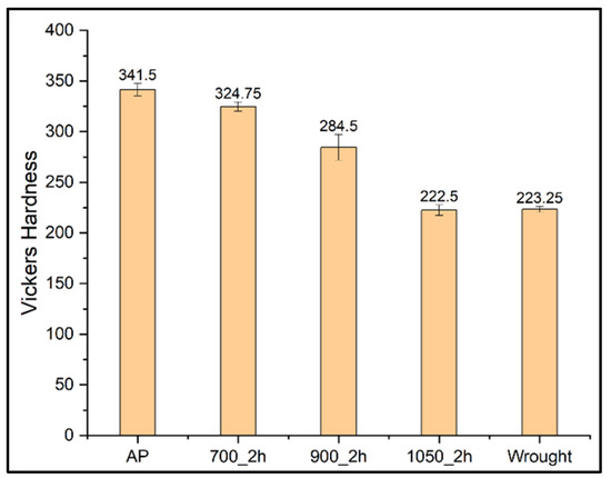 The variations in microstructure and precipitation with direct aging in this work showed a significant change in microhardness behavior. Figure 10 shows the evolution of microhardness with heat treatment of L-PBF IN625 at increasing temperature compared with a wrought IN625 counterpart prepared by aerospace material specification AMS 5599 [39]. The hardness of AP IN625 was 341.5 ± 6.06 HV1.0, which was the highest measured of all samples and significantly higher than the wrought sample of 223.25 ± 2.86 HV1.0. Hardness then reduced somewhat to 324.75 ± 4.49 HV1.0 after heat treatment at 700 °C for 2 h. The hardness further decreased to 284.5 ± 12.66 HV1.0 upon heat treatment at 900 °C. The lowest hardness values were achieved in the 1050 °C heat treatment, where the hardness reduced to 222.5 ± 5.17 HV1.0, nearly equivalent to the hardness of wrought IN625.