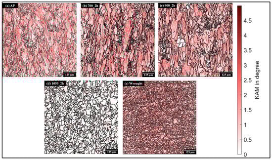 The increase in grain size from the AP condition to the 700_2h and 900_2h conditions is attributed to the thermal coarsening due to annealing. However, an unexpected drop in grain size is observed in the 1050_2h sample. Although precipitates, elemental segregation, melt pool boundaries, and dendritic structure are dissolved at this temperature, the counteracting effect of recrystallization caused this reduction in grain size. This sudden drop in grain size at 1050 °C can be explained by Figure 11 which also provides the kernel average misorientation plots for all L-PBF samples. It can be observed that there is a dominance of misorientations inside the grain for the AP, 700_2h, and 900_2h samples since there are groups of dendrites that are slightly misoriented with each other. With heat treatment at 1050 °C, those groups of dendrites make their own grains, causing the larger grains to break apart into smaller grains and almost complete recrystallization. It is interesting to observe that the KAM plot of wrought IN625 shows the presence of misorientation, hence the strain in the commercially available material that was induced via thermo-mechanical processes to obtain the desired mechanical properties. This detailed analysis of the texture and the grain structure using EBSD is unique to this study, which will help other researchers interpret the microstructural analysis of L-PBF IN625 correctly.