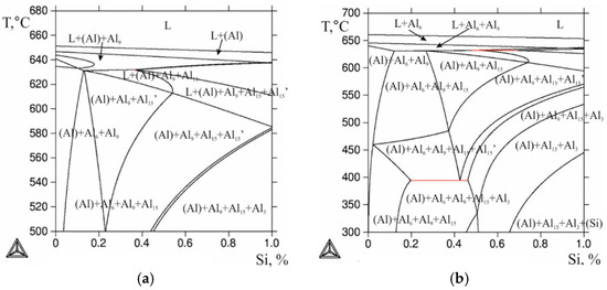 According to the literature data [15] and according to the simulation results in the ThermoCalc program, the Al–Fe–Si–Mn diagram has a complex structure, and the following phases can be in equilibrium with (Al):