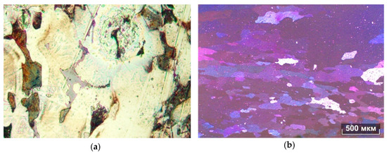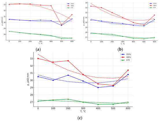 With increasing temperature, increasing resistivity is observed for both ingots (Figure 4a) and sheets (Figure 4b,c), which is obviously caused by increasing the concentration value according to the solvus of the Al–Fe diagram. The difference in resistivity of the alloys of 0.5% Fe and 0.8% Fe again begins to increase, reaching the maximum at 650 °C.