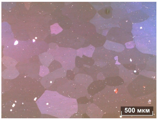 Optical micrograph (OM) of Al–0.8% Fe alloy after hot rolling with intermediate annealing at 650 °C. The structure shows equiaxed grains with moderate size distribution. Scale bar—500 μm.