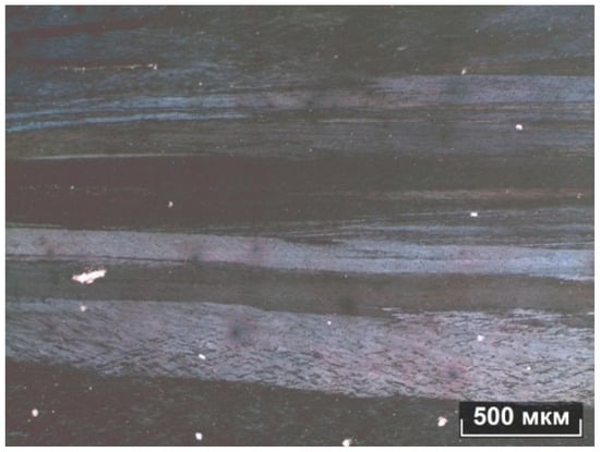 Optical micrograph (OM) of Al–0.8% Fe alloy after hot rolling without intermediate annealing (condition S300). Elongated intermetallic phase regions are visible in the dendritic structure. Scale bar—500 μm.